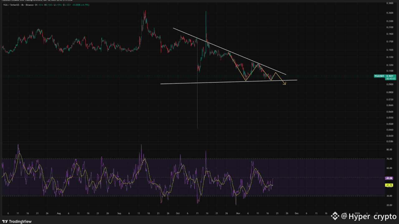 I can see descending triangle pattern. This pattern is marked by lower highs and a strong horizontal support level near $0.095. A descending triangle is classically a bearish continuation pattern ⬇️.The continuous selling pressure from the descending resistance line suggests that the support is vulnerable.The current technical setup suggests the bears 🐻 have the advantage and are trying to force a drop below that critical $0.095 support.