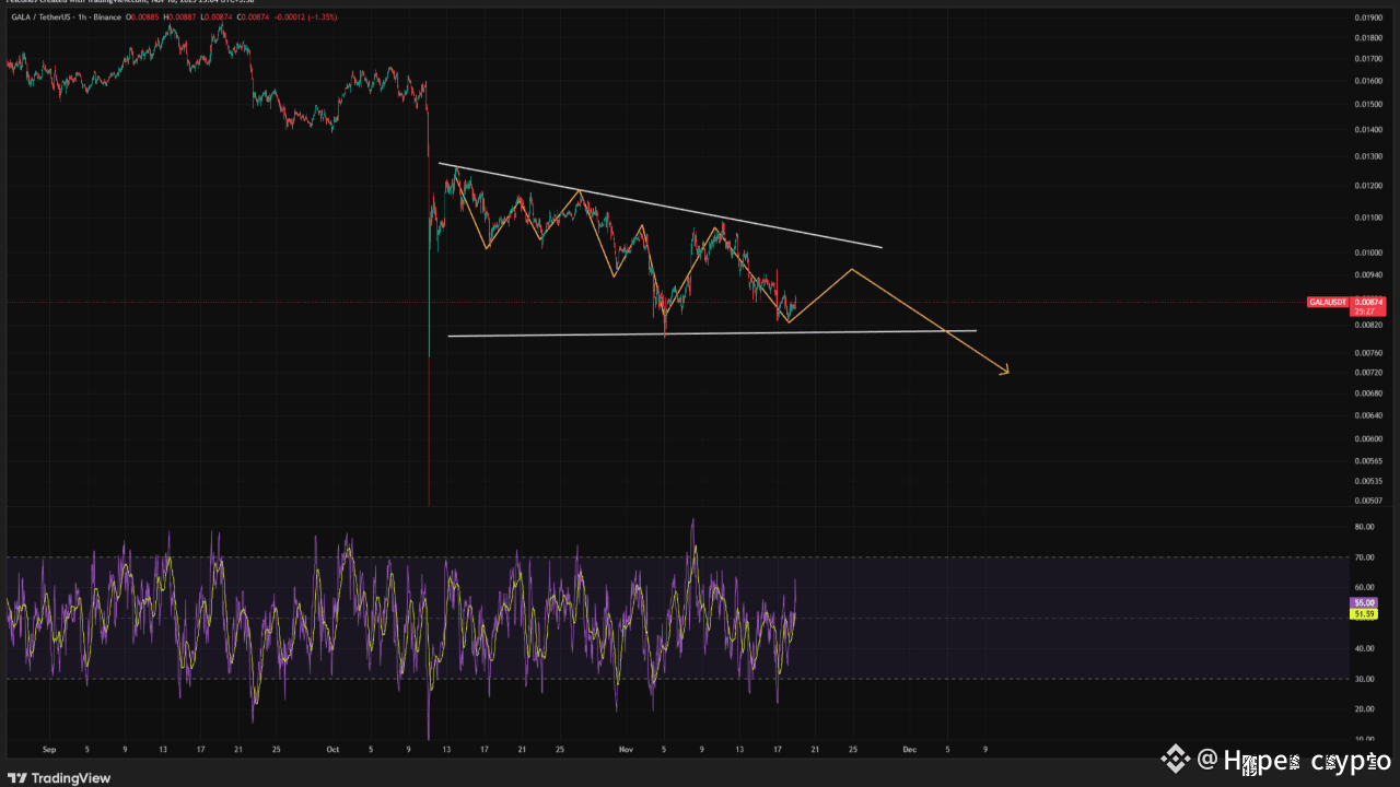 I can see GALA descending triangle 📐 pattern This pattern has lower highs pressing against a strong horizontal support level near $0.0089. This is typically a bearish continuation pattern ⬇️. The price is currently near the support line. The projected path (orange arrow) suggests a move up to retest the descending resistance before breaking down 💥 below $0.0089, aiming for the $0.0080 are