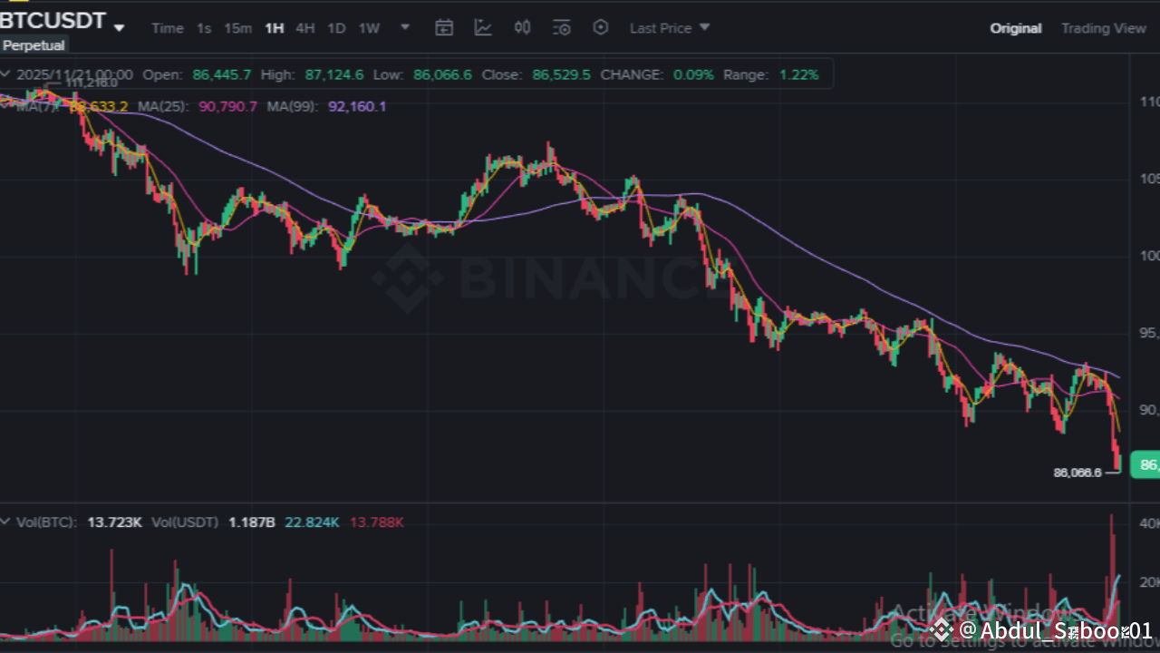BTC dropped sharply from ~$95,000 → now ~$86,500 with no strong bounce.