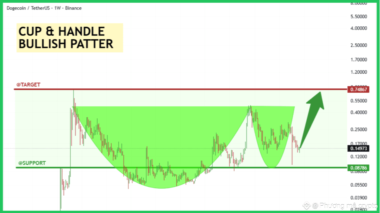 Trên khung thời gian 1W, $DOGE đã hoàn thành phần "Cup" và đang trong quá trình tạo phần "Handle" (tay cầm) ở vùng giá hiện tại. Đây là một mô hình tiếp diễn xu hướng tăng cực kỳ mạnh mẽ, thường dẫn đến mục tiêu cao bằng độ sâu của chiếc cốc. Vùng hỗ trợ cứng cần chú ý là $0.08786. Nếu giá phá vỡ và đóng nến trên đường viền cổ hiện tại (khoảng $0.17 - $0.20), mục tiêu tiềm năng theo mô hình sẽ là vùng kháng cự lịch sử $0.74867.