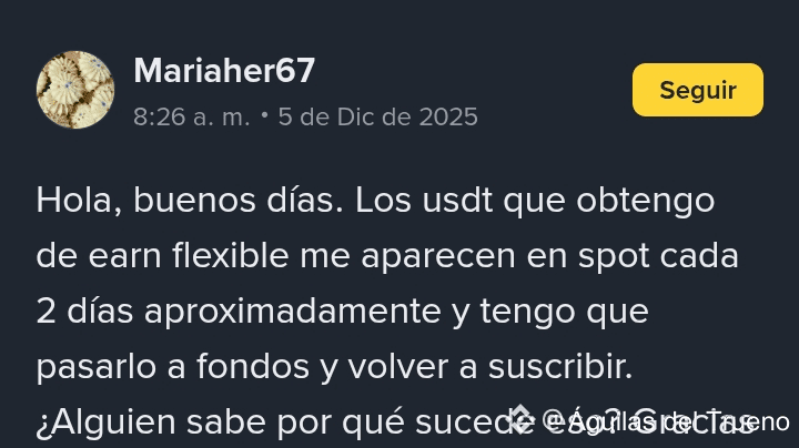 Si cada dos días te caen los intereses de Earn Flexible en tu billetera spot y tienes que volver a moverlos a fondos para suscribir de nuevo no es un error es el funcionamiento normal de Earn Flexible