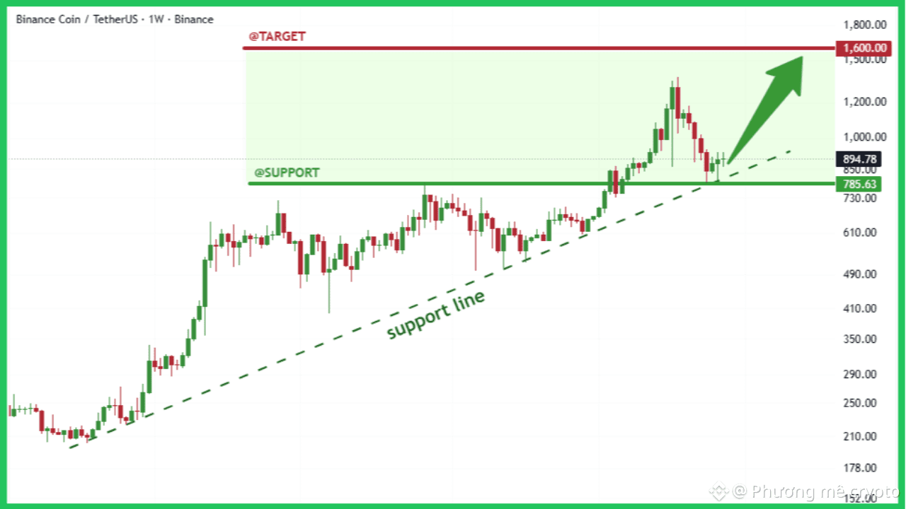 Trên khung 1W, $BNB đang thể hiện sức mạnh phi thường. Sau cú điều chỉnh vừa qua, giá đã chạm chính xác vào đường hỗ trợ xu hướng tăng (support line) kết hợp với vùng hỗ trợ ngang $785.63. Đây là một điểm bật kỹ thuật hoàn hảo (perfect bounce).