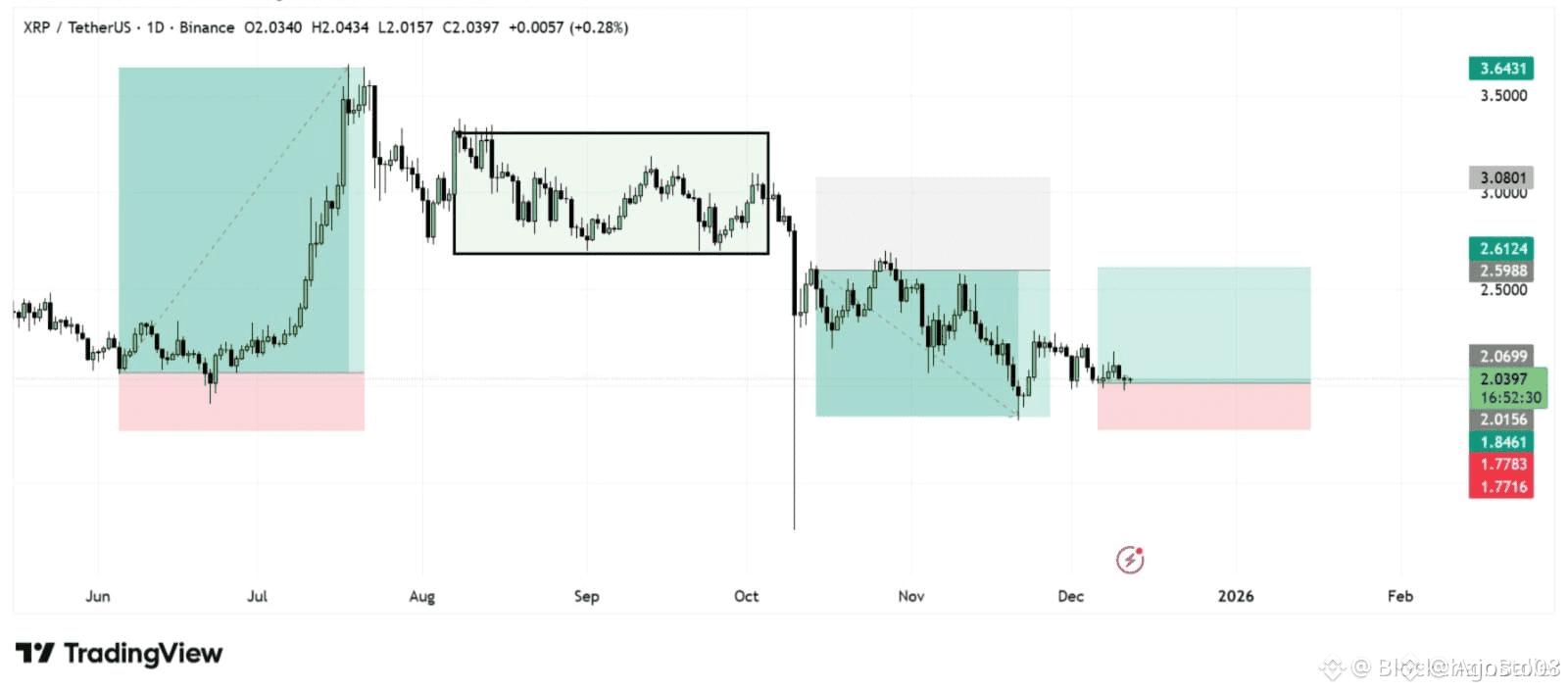Esto es $XRP al precio actual ~2.04, sentado dentro de una zona de decisión importante....