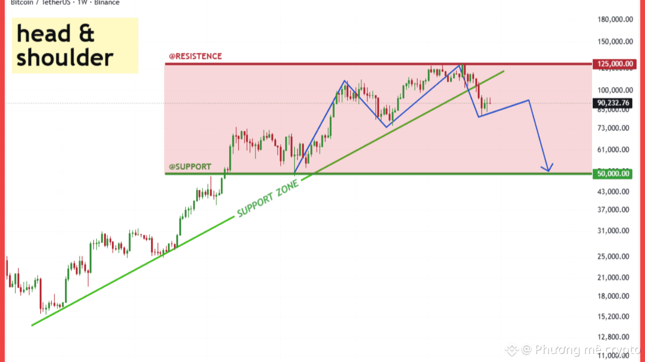 Phân tích kỹ thuật cho thấy sau khi đạt đỉnh tại vùng Kháng cự $125,000, $BTC đã hình thành mô hình Vai Đầu Vai (H&S) kinh điển. Quan trọng hơn, giá đã phá vỡ (breakdown) đường Neckline màu xanh lá cây, vốn là đường hỗ trợ xu hướng tăng dài hạn. Hiện tại, chúng ta đang thấy giá cố gắng hồi lên lại để retest đường này, quanh mốc $90,000. Nếu $BTC không thể lấy lại được đường hỗ trợ này, mục tiêu giảm giá tiếp theo sẽ là vùng Hỗ trợ mạnh tại $50,000. Đây là một vùng đệm tâm lý và kỹ thuật quan trọng.