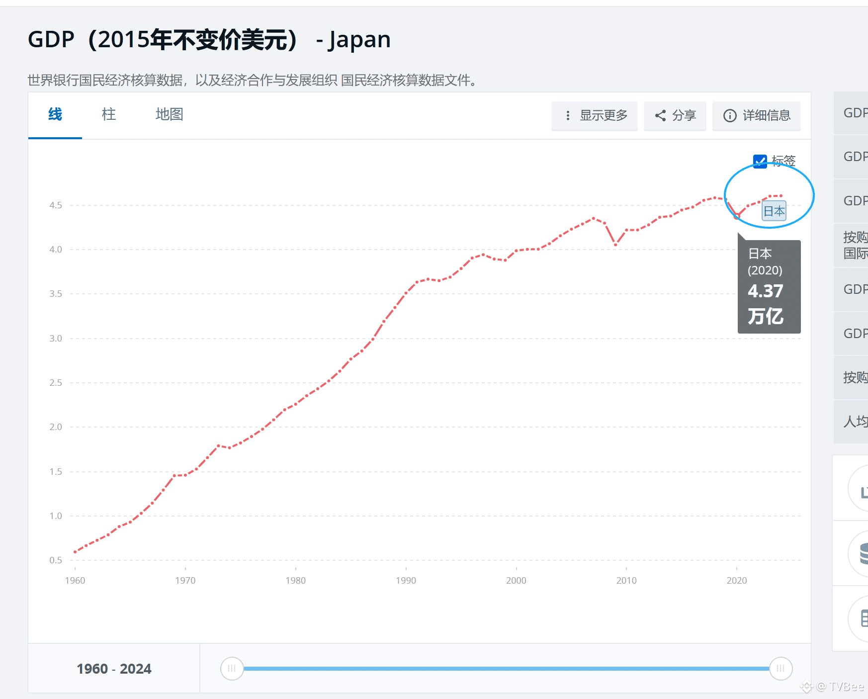 但是,剔除通胀因素,以不变价美元计量的日本GDP,2020年以后确实增长趋势,但也并没有非常夸张的增长。