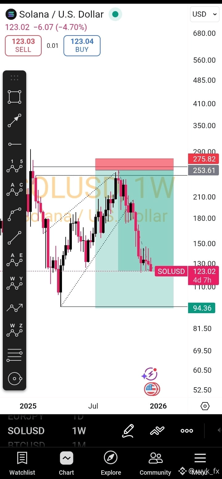 Current State: $SOL is currently trading around $123.02, having lost over 47% from the recent high on this chart. The bear trend is in full force, and traders should be highly cautious about trying to catch this falling knife.