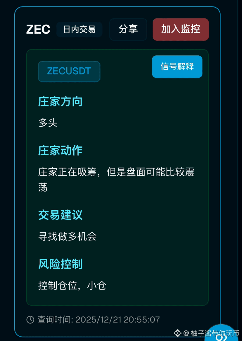#ZECUSDT 当前日内监控信号整体偏多,庄家方向明确标注为多头,系统提示庄家正在吸筹阶段,但盘面可能出现较大幅度震荡,交易建议为寻找做多机会,同时强调控制仓位、小仓操作,风险控制要求严格,避免重仓追高。