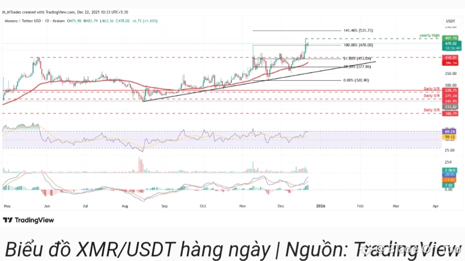 At the time of writing, Monero is trading around $478, maintaining a strong bullish structure above key moving averages.