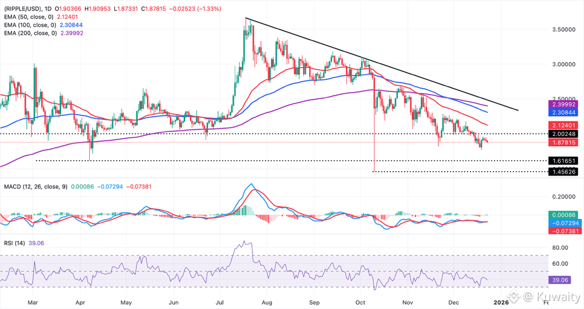 تظل عملة XRP تحت مستوى 1.90 دولار، متأثرة بصورة فنية متدهورة حيث ينخفض مؤشر القوة النسبية.
