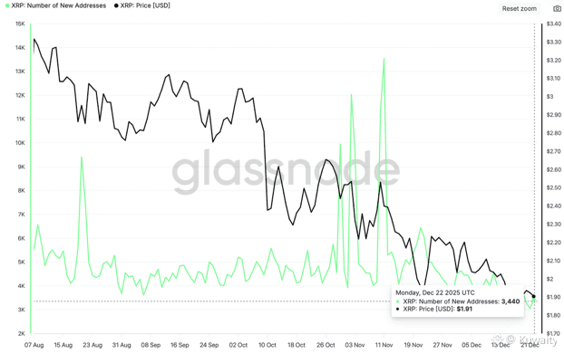 ظل عدد العناوين الجديدة التي تم إنشاؤها على دفتر XRP (XRPL) منخفضًا نسبيًا، حيث بلغ متوسطه 3440 اعتبارًا من يوم الاثنين، انخفاضًا من 4501 في 1 ديسمبر وحوالي 13500 في 11 نوفمبر.