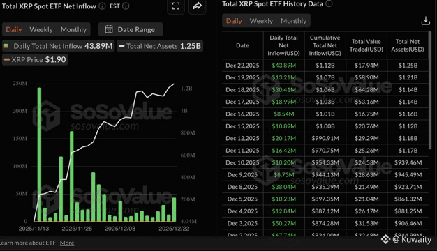 كما أفادت التقارير، سجلت صناديق XRP المدرجة في الولايات المتحدة تدفقات تقارب 44 مليون دولار يوم الاثنين، ارتفاعًا من حوالي 13 مليون دولار يوم الجمعة. ويبلغ إجمالي التدفق الصافي 1.12 مليار دولار، والأصول الصافية 1.25 مليار دولار.
