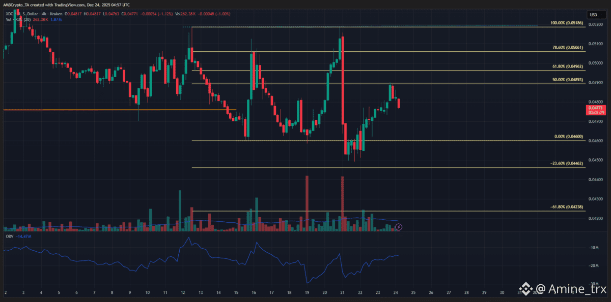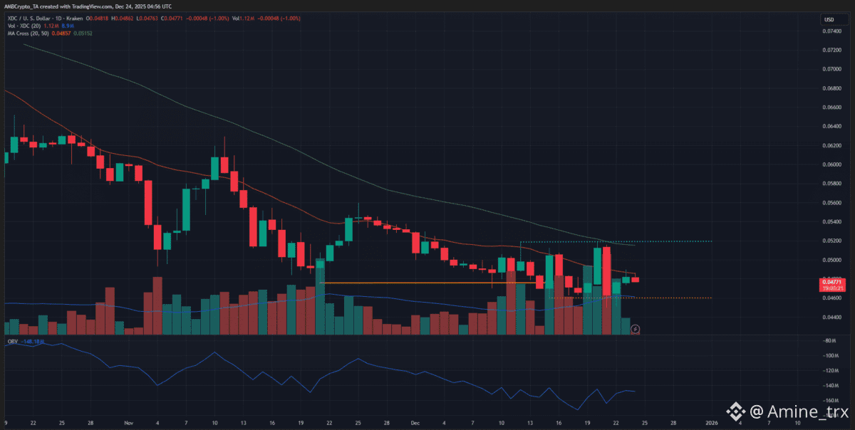 ✦ ما زال XDC يتحرك ضمن اتجاه هابط عام، رغم التقلّبات قصيرة الأجل.