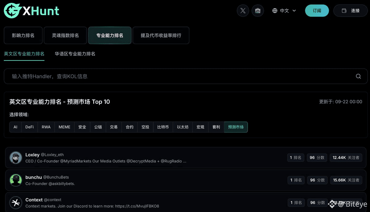 也可以从增加了解开始。@xhunt_ai 的能力模型近期新增了预测市场模块,可以通过kol.xhunt.ai在专业能力排名板块筛选“预测市场”,关注赛道头部KOL。