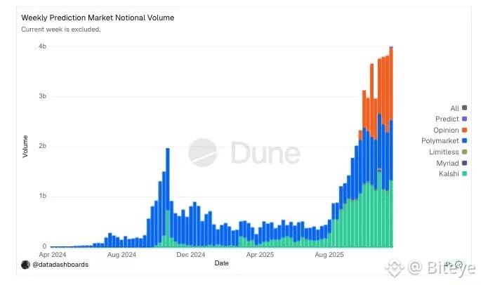 正如图表所示,预测市场的周交易量在近期迎来了史无前例的指数级爆发,峰值一度突破 40 亿美元。