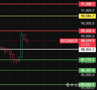 如果今天回踩跌破88000这个位置,那行情开始走弱,继续回踩下方支撑位留意87175-86370-85270这几个位置附近!#BTC走势分析