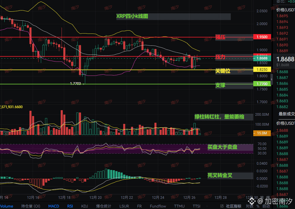 从一小时图看,XRP现在卡在1.87附近震荡,上面压着一堆阻力:1.876、1.90、1.95,层层叠叠像座山。但下面呢?撑得住的地方不多,1.77是关键命门。有意思的是,MACD虽然还在零轴下面晃悠,但死叉已经在转金叉的路上——这是什么信号?往往是大动前的安静。量能缩了,买盘却慢慢抬头,说明有人在悄悄吃货。