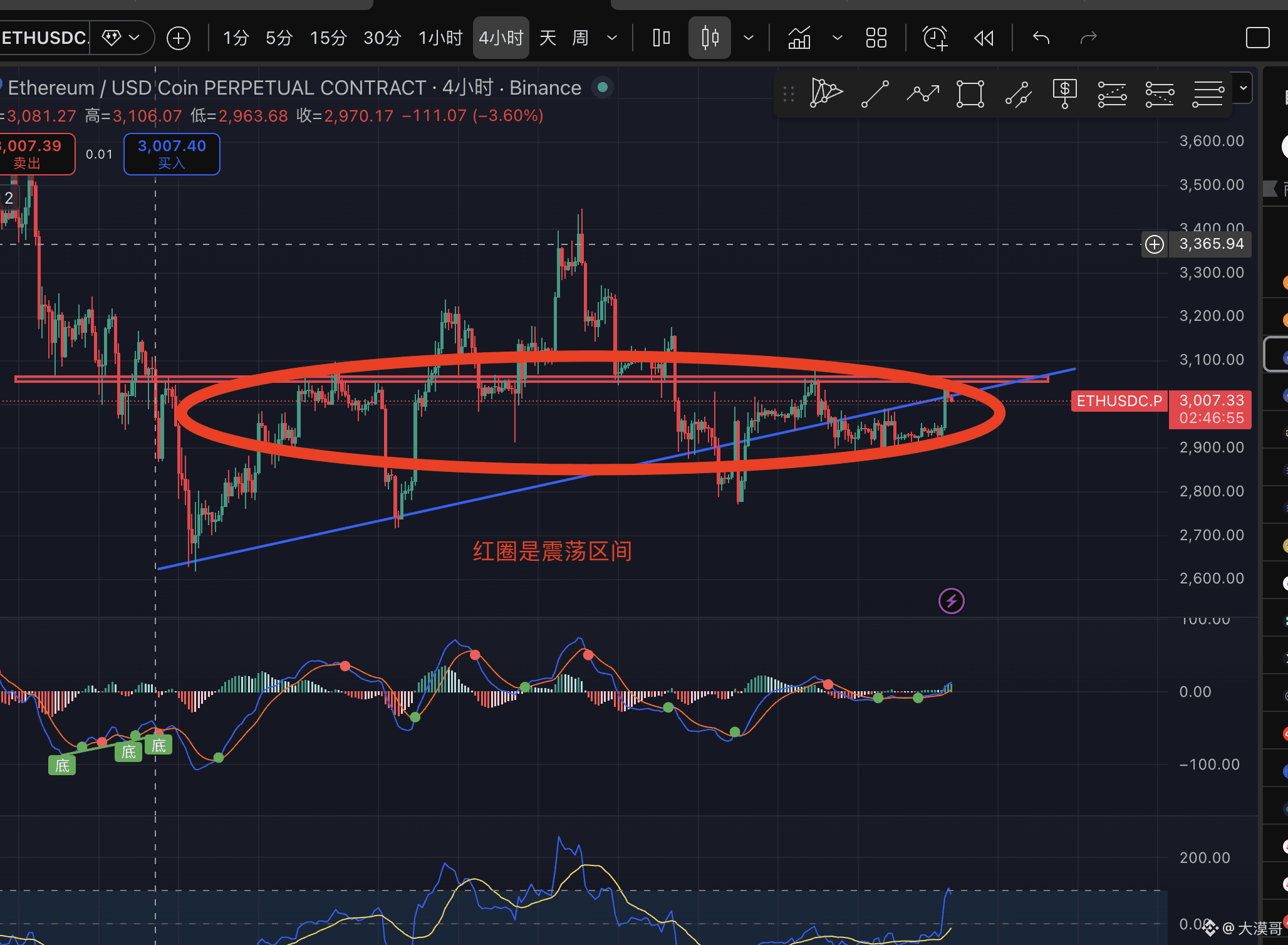 再看以太坊,以太目前跟大饼的走势差不多,压力位在3000附近,这个位置突破了后续才有机会,另外红色的圈也是属于震荡区间,需要他走出这个区间,行情才会改变或者反转,目前看还是不太乐观,所以很多人就在这个压力位开空,寻找做空的机会。