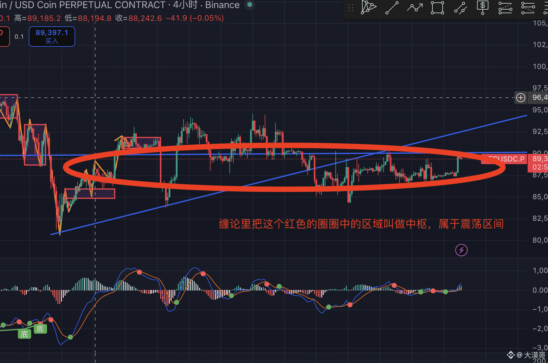接下来说行情,看图,咱就分析大饼和以太,其他的不看了,大饼是一根趋势线没站住,直接掉下去后,处于一个长时间的震荡区间,好在他的低点没有创新低,什么时候他一直保持不在创更低的低点,并且逐步的抬高,创了更高的高点就有希望了,目前来看9w附近压力还是很大的。