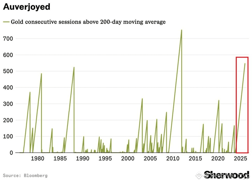 Gold prices have remained above their 200-day moving average for ~550 trading days, the 2nd-longest streak on record.