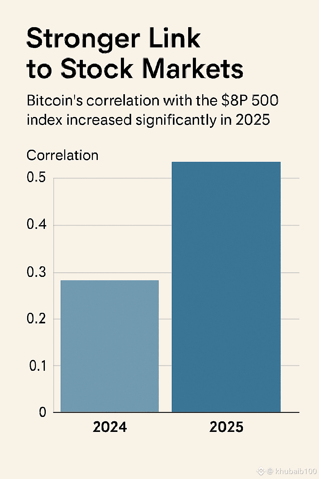 $BTC Bitcoin's correlation with major stock indexes increased significantly in 2025.Its average correlation with the S&P 500 rose to 0.5, up from 0.29 in 2024. This means Bitcoin increasingly moves in line with general "risk-on" or "risk-off" sentiment in broader financial markets.