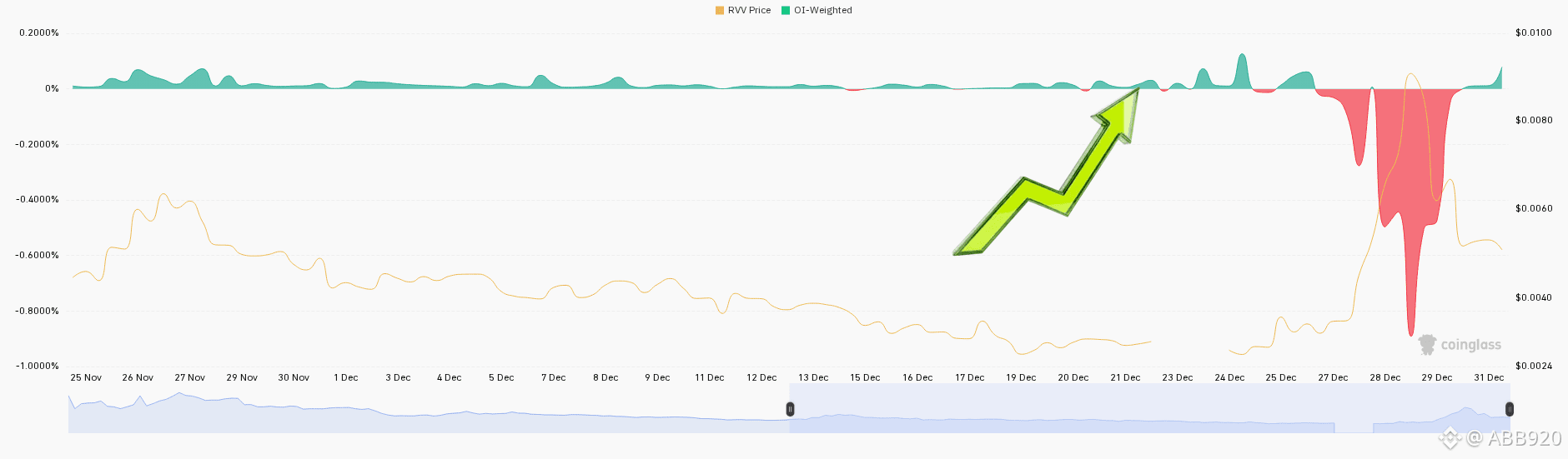 Then, out of nowhere, RVV decided to celebrate Christmas early. Around December 20th, it started a vertical climb, pumping hard from sub-$0.004 to nearly $0.010 by December 27th. The OI-Weighted indicator turned green and pushed up during this period, confirming some serious buying interest was fueling that rally. For a moment, it looked like RVV was on a proper moon mission.