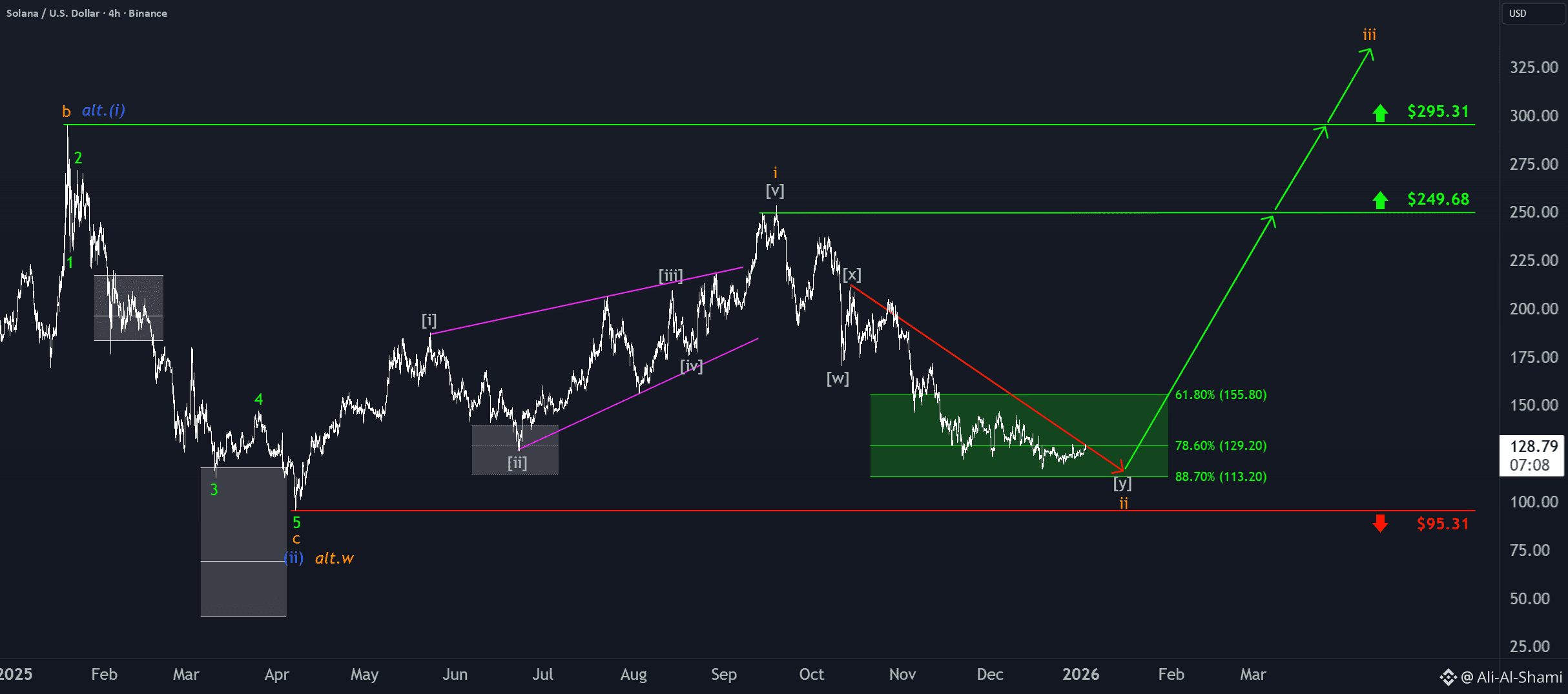 ارتفعت سول قليلاً، لكنها لا تزال ضمن منطقتنا المستهدفة الخضراء ($155.80 – $113.20). إذا لم يكن قد حدث بالفعل، من المتوقع أن يحدد الألتكوين القاع للمرحلة ii باللون البرتقالي ضمن هذا النطاق قبل أن يتحول إلى الأعلى. يجب أن تدفع المرحلة iii التالية باللون البرتقالي السعر فوق مستويات المقاومة عند $249.68 و $295.31.