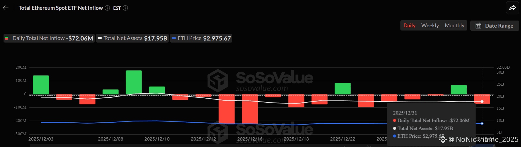 Макроэкономические индикаторы также подтверждают наличие препятствий для восстановления цены. Спотовые ETH-ETF завершили 2025 год с негативными показателями: чистый отток средств составил $72 млн. Подобная статистика отражает сдержанный настрой институциональных фондов в период общей неопределенности.
