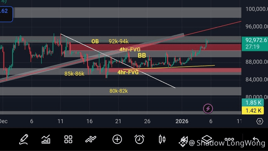 若 BTC 在 日线级别收盘站上 $92,500,价格极有可能迅速推进至 $95K–$96K 区域。