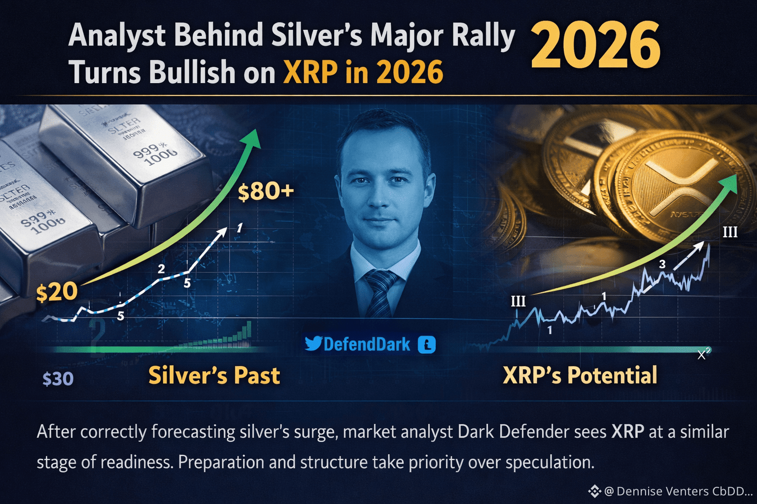 In 2026, well-known market analyst Dark Defender (@DefendDark) is drawing renewed attention after linking $XRP ’s current technical structure to silver’s historic rally. Dark Defender previously forecast silver’s move from the $20 region to the $80 level months in advance—a target that was later exceeded as prices briefly touched $84.