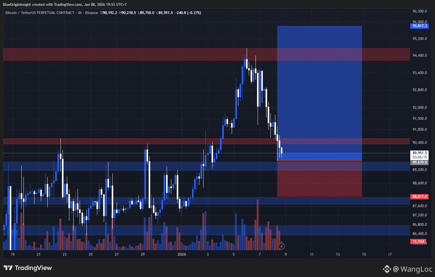 After failing to hold above the 94k–95k supply zone, $BTC has pulled back into the 89k–90k area, which aligns perfectly with a key H4 demand zone.