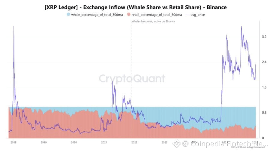 With leverage flushed out, attention has shifted to on-chain and institutional signals. According to CryptoQuant data, whales are still the dominant force, accounting for about 60% of XRP inflows to Binance, while retail traders make up the rest.