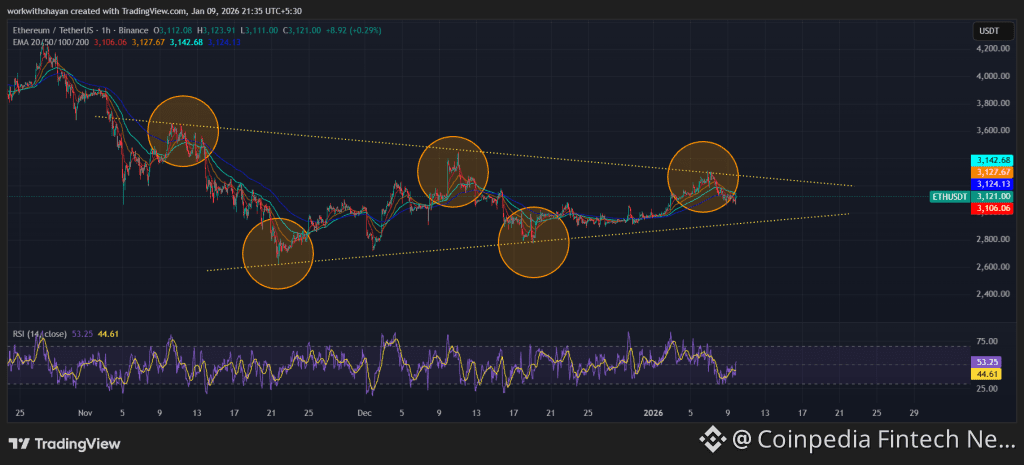 Ether price is hovering within a tight trading channel over the past few months and buyers are unable to keep prices above the triangular channel. As a result, ETH has slipped back into its December trading range. As of writing, ETH price trades at $3,106, surging over 0.3% in the last 24 hours.