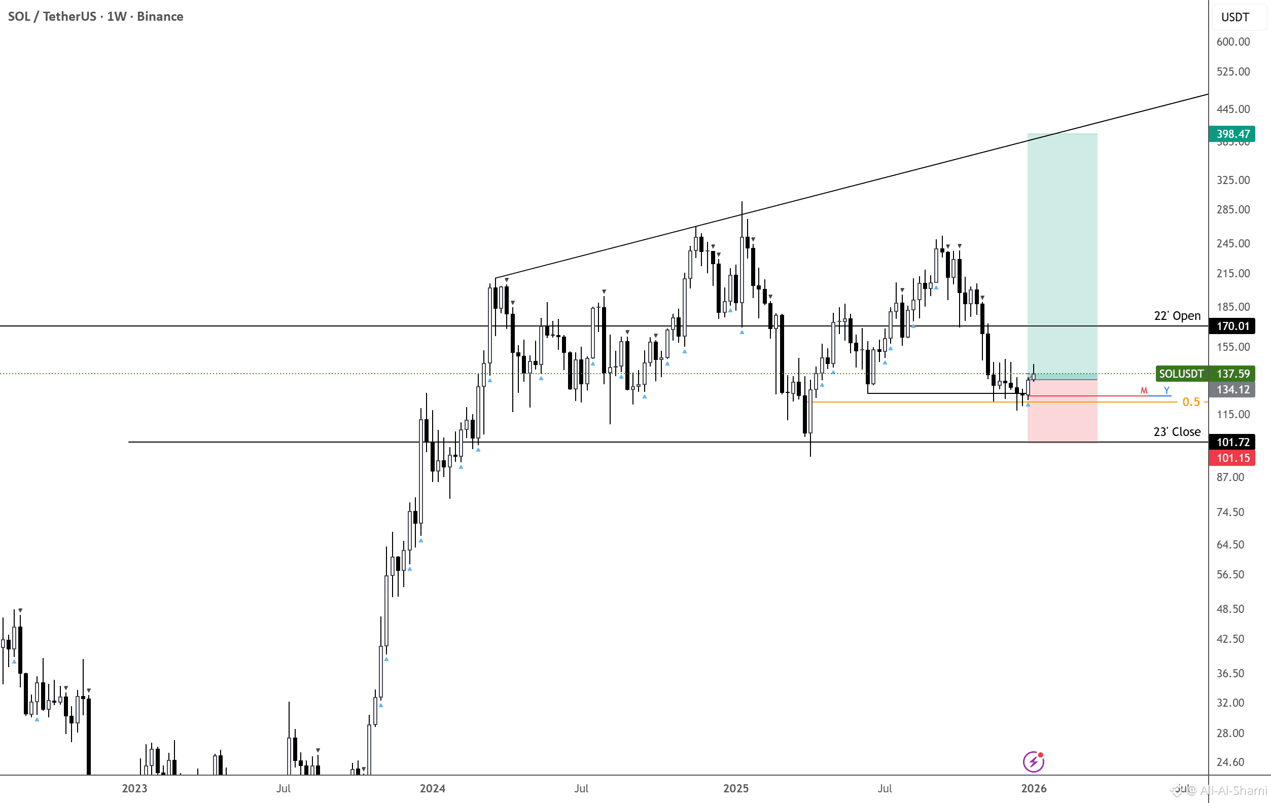 هذا أحد أكثر المناطق أمانًا للبحث عن صفقات طويلة في SOL، طالما استمر السعر في الحفاظ على مستوى 121 أو أعلى، والذي يمثل منطقة القيمة الشهرية.