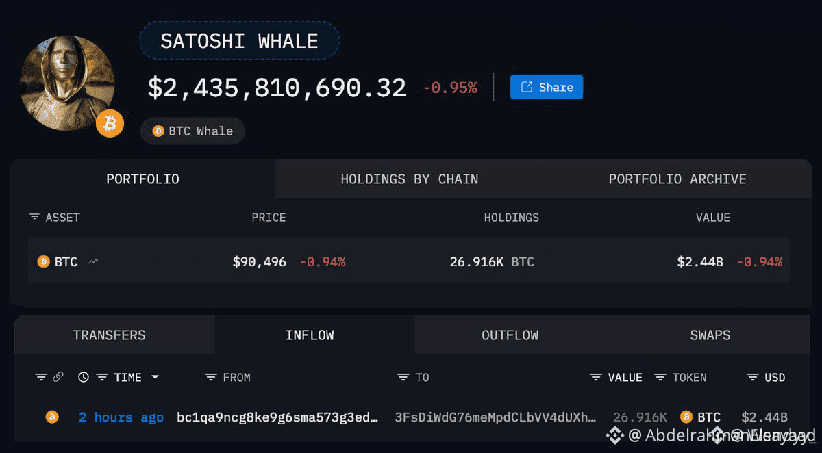 بعد أكثر من عقد من الصمت، ظهر عُملاق من عصر ساتوشي بشكل مفاجئ — والتوقيت لا يمكن تجاهله. هذا المحفظة النائمة اشترت حاليًا حوالي 26,900 بيتكوين، وهي رهان هائل بقيمة 2.45 مليار دولار وفقًا للأسعار الحالية. آخر مرة ظهر فيها هذا الكيان؟ في عام 2011، حينما كان البيتكوين لا يزال غير معروف تقريبًا لدى معظم الناس.