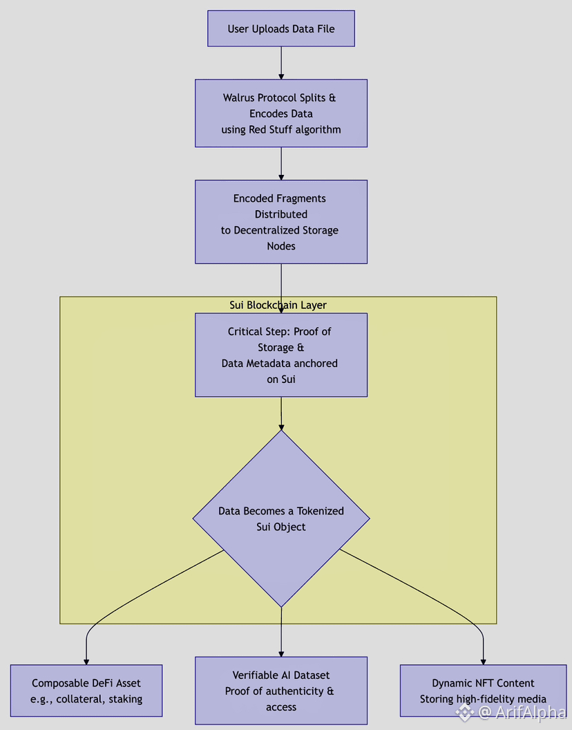 This process highlights a critical synergy. Walrus handles the heavy lifting of secure, distributed file storage using its innovative Red Stuff encoding for efficiency. However, the "trust anchor" and the source of composability live on Sui. By storing the proof of storage and metadata on-chain, every piece of data in Walrus becomes a native Sui object. This is revolutionary because it allows data and storage capacity itself to be tokenized and woven directly into smart contracts and applications.