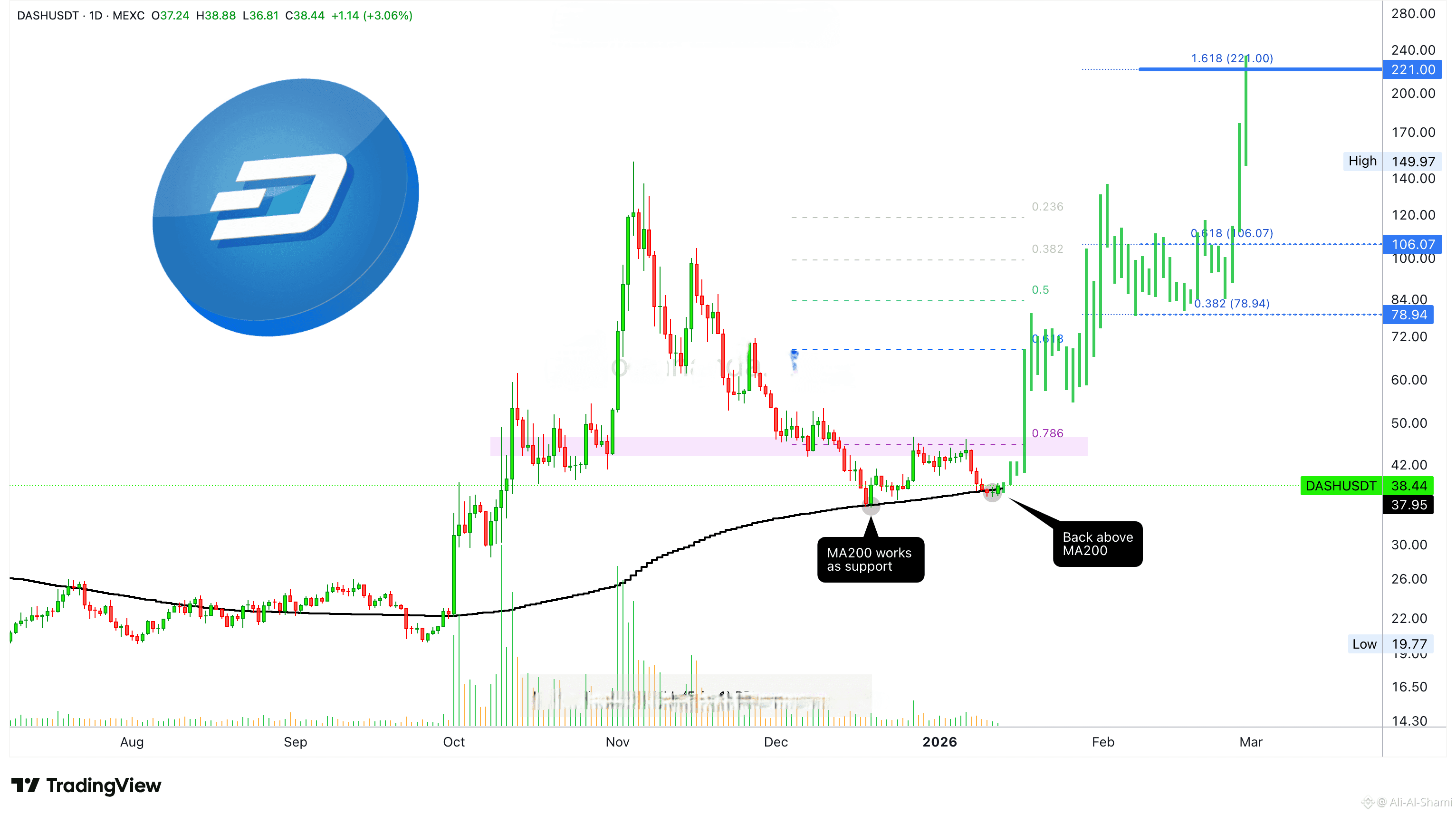 أظهر داش أداءً جيدًا مؤخرًا، لكن كل شيء على وشك أن يتحسن أكثر. من المتوقع أن يحقق داش/usat هدفًا أعلى. يقع الهدف التالي عند 222 دولارًا. كان الهدف السابق 150 دولارًا، وانطلقت الحركة الصاعدة الكاملة في غضون 39 يومًا فقط. هذا هو نموذج رسم بياني كلاسيكي لمشروع كلاسيكي.