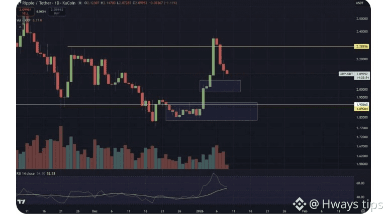 “Now the discussion becomes whether we move into the first blue box as a weaker area of support and hold there… or whether we come back down into the deeper support zone around $1.90 to $1.82 and hold there,” he wrote. “That deeper area is my preferred risk to reward zone for placing long positions, and that is where I will be looking to get back into an XRP long and add to my position if we see that move specificX