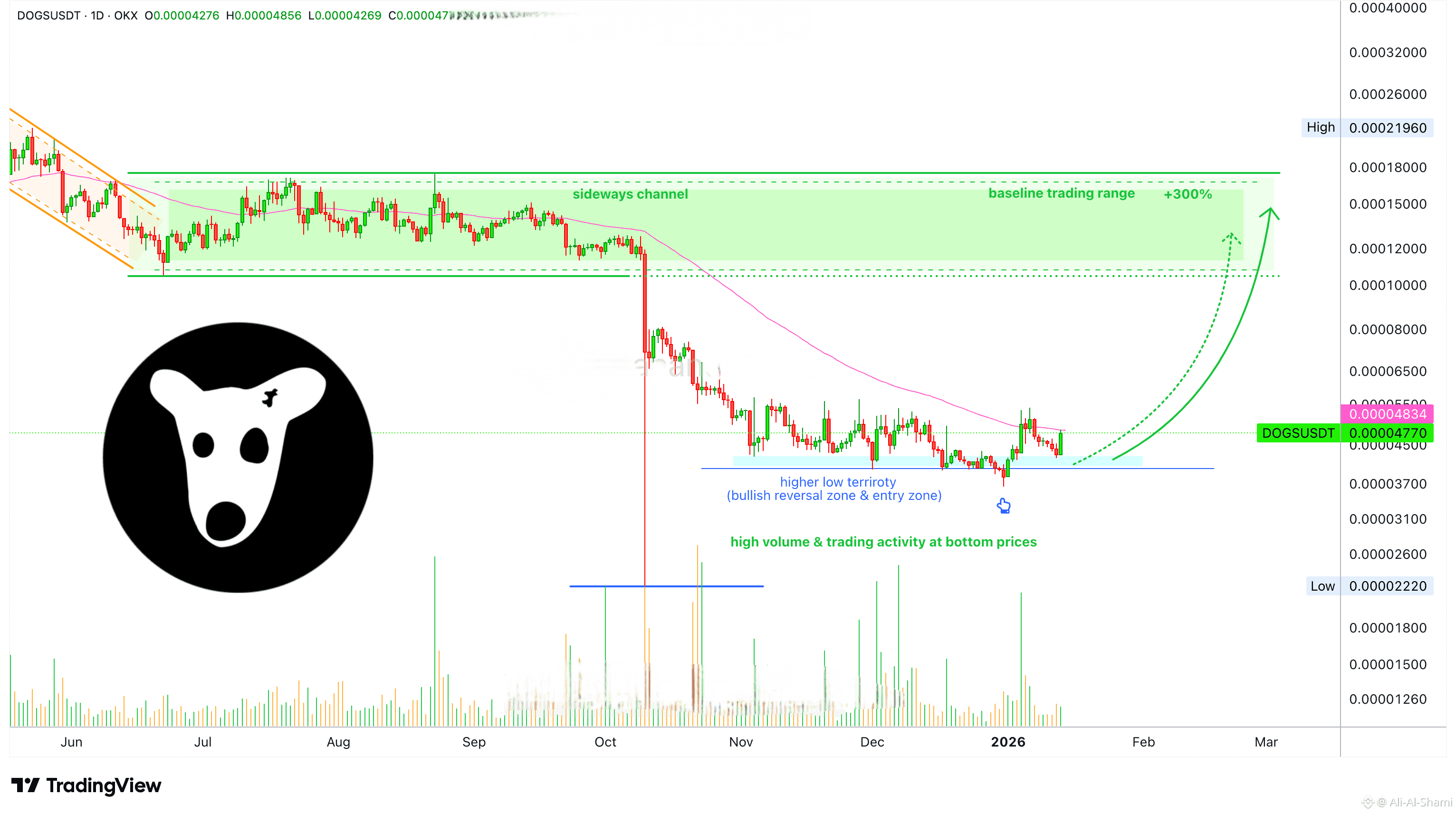ما يزال مبكرًا بالنسبة لـ DOGSUSDT والسبب واضح جدًا؛ فالحركة لا تزال تحدث تحت EMA55. نظرًا لأن Dogs تخرج من مستوى منخفض كبير، فإن هذا التداول تحت EMA55 يُعد إشارة صعودية. لدعم هذه الإشارة، لدينا حجم كبير جدًا في 4 يناير، وفي ديسمبر وأيضًا نوفمبر. الرسم البياني مليء بشرائح حجم خضراء كبيرة.
