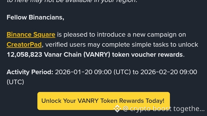 Vanar Chain (VANRY) continues to strengthen its presence in the Web3 space as Binance Square introduces a new CreatorPad campaign designed to reward community participation and high-quality content creation. Through this initiative, verified users can unlock a share of 12,058,823 VANRY token voucher rewards by completing simple tasks such as posting insights, sharing knowledge, and engaging with other creators on the platform.