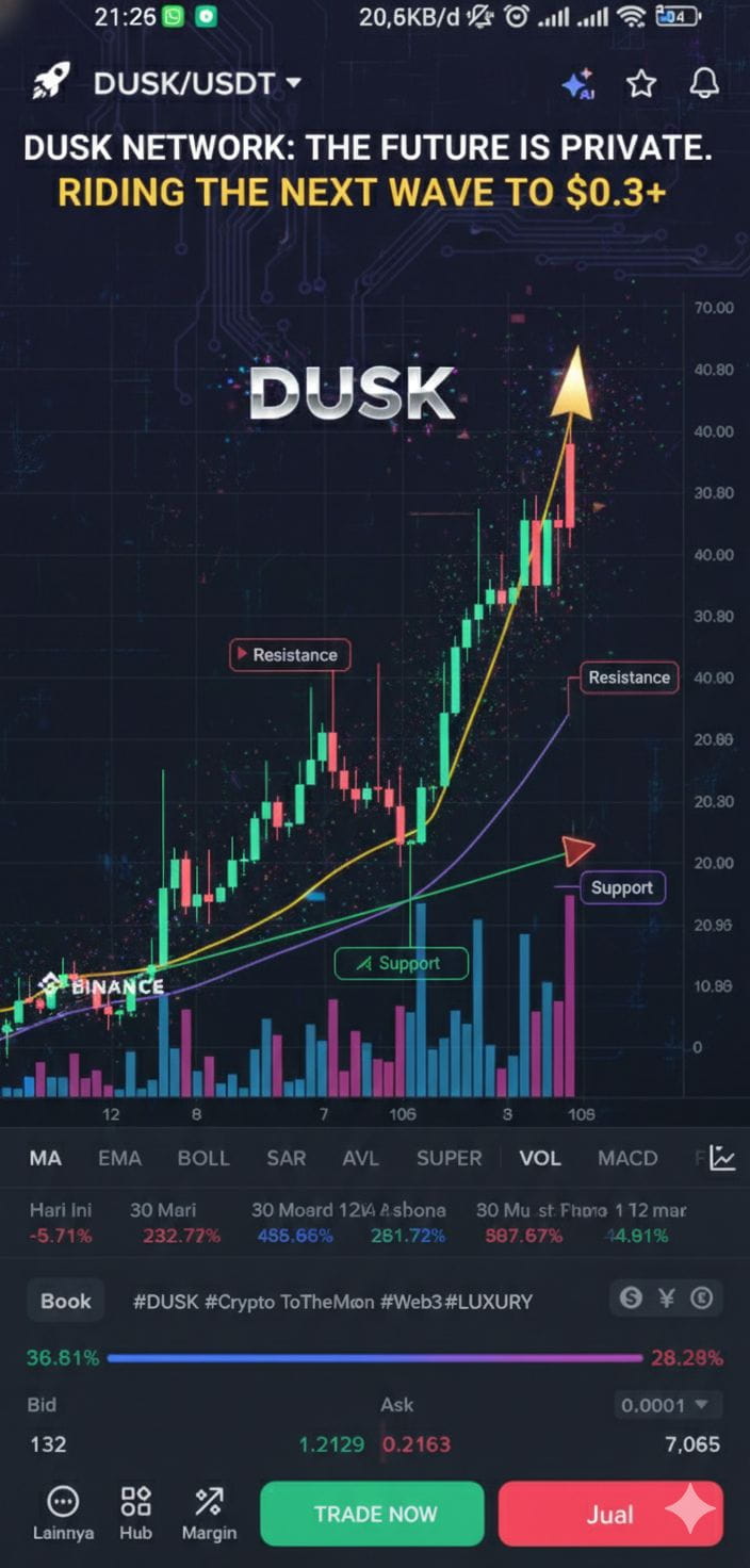DUSK ini punya fundamental kuat di sektor Privacy & RWA (Real World Assets), jadi memang salah satu koin yang lagi "panas" di 2026 ini.