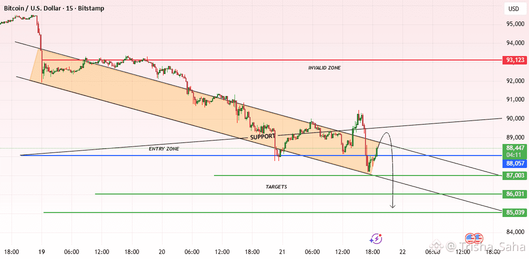 Plan shown on chart: I’m looking for a sell on a lower‑timeframe rejection near the channel’s upper boundary / Entry Zone ~88,057 (blue line), in line with the prevailing intraday downtrend.