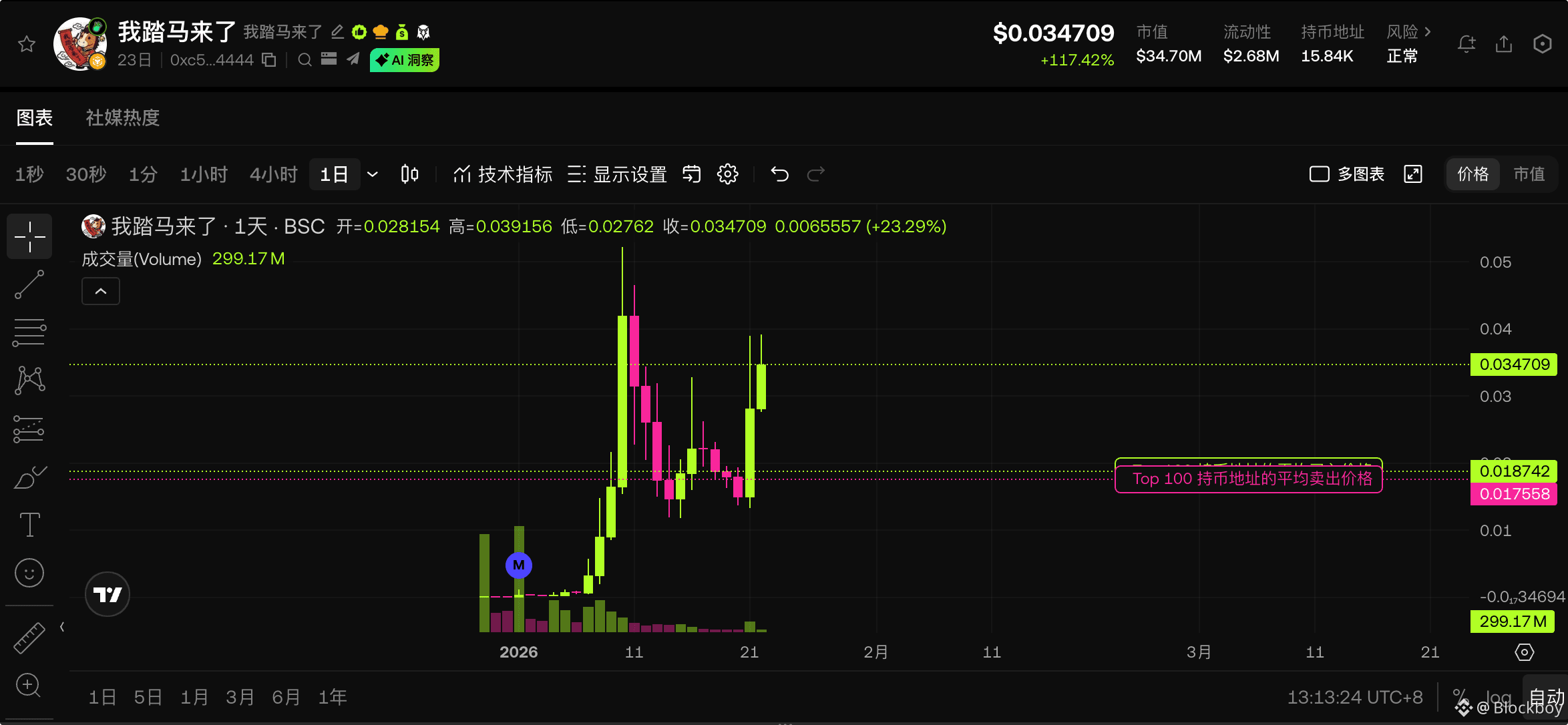 量能配合:成交量(289.79M)保持活跃,并非缩量上涨,说明当前价格区间有真实的换手,新进资金正在消化 $0.030 下方的获利盘。