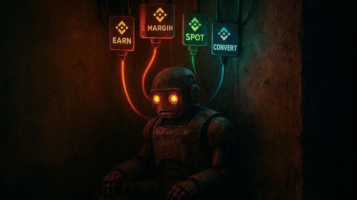 "Create an image of a old, dusty robot (SENT) sitting powered down in a corner. Multiple vibrant, glowing Binance-branded cables are plugging into it from above—one for 'Earn', one for 'Margin', one for 'Spot', one for 'Convert'. The robot's eyes begin to flicker with light. Text: 'PLUGGED BACK IN.' Style: cinematic, symbolic, cyberpunk revival."