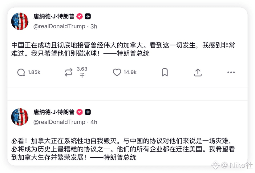 在结束了格陵兰的关税,本来想要喘口气结果 $BTC 又在下跌,而且在周末就跌的挺厉害了,这次引发的可能有三种情况,第一就是川普对加拿大和中国的一项贸易协定非常的不满,但今天川普仍然连发了两篇文章来告诫加拿大再将关税当武器的这个方面川普是从不吝惜的,所以市场也在担心周一的时候加拿大和中国会不会做出联合的抵制,虽然都还是口头上的,但如果真的形成了“对抗”,市场一定会在预期可能发生的风险,虽然也有可能会发生 TACO ,但市场绝对不会无动于衷。