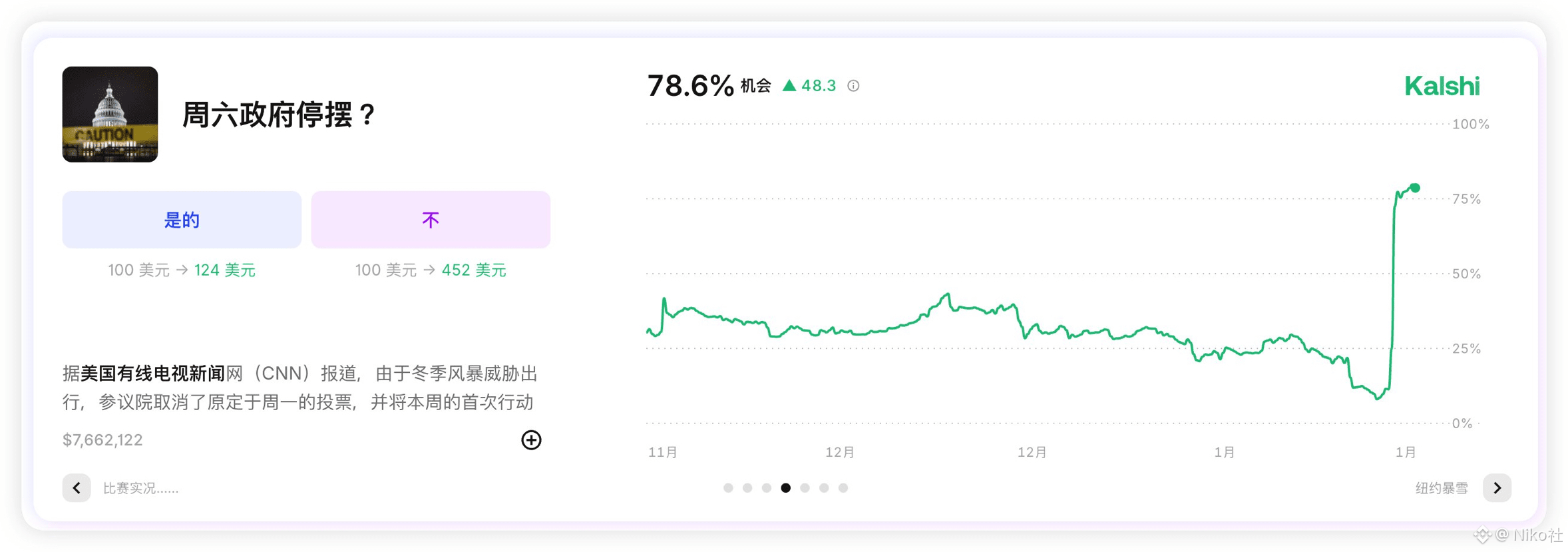 导致目前 Kalshi 预期停摆的概率直接冲到了 78.5% ,不过这次的停摆可能并不像去年10月一样几乎全面的停摆,这次已经有部分的职能部门拿到了全年的预算,不会进入停摆,所以相对来说,即便是进入停摆,但和10月相比应该规模不会更大。