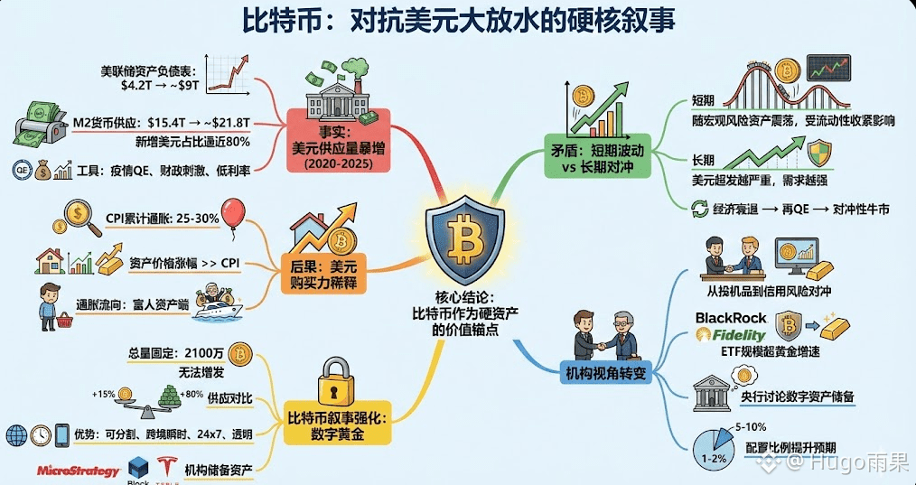长期看,美元超发越多,对“非主权、固定供应”的硬资产需求就越强。2020-2021年的大牛市,本质就是对疫情大放水的反应;2025-2026年如果再次出现系统性流动性扩张(经济衰退→再QE),比特币很可能迎来新一轮“对冲性牛市”。机构视角的转变