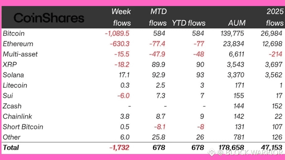 When $1.73B exits crypto ETPs in a single week, the instinct is to read panic into the tape. But the flow tells a more precise story. Pressure was released where it always is first: the most liquid wrappers. $BTC and $ETH absorbed the bulk of the exits not because conviction broke, but because allocators can reduce exposure there quickly, cleanly, and without making a philosophical statement.