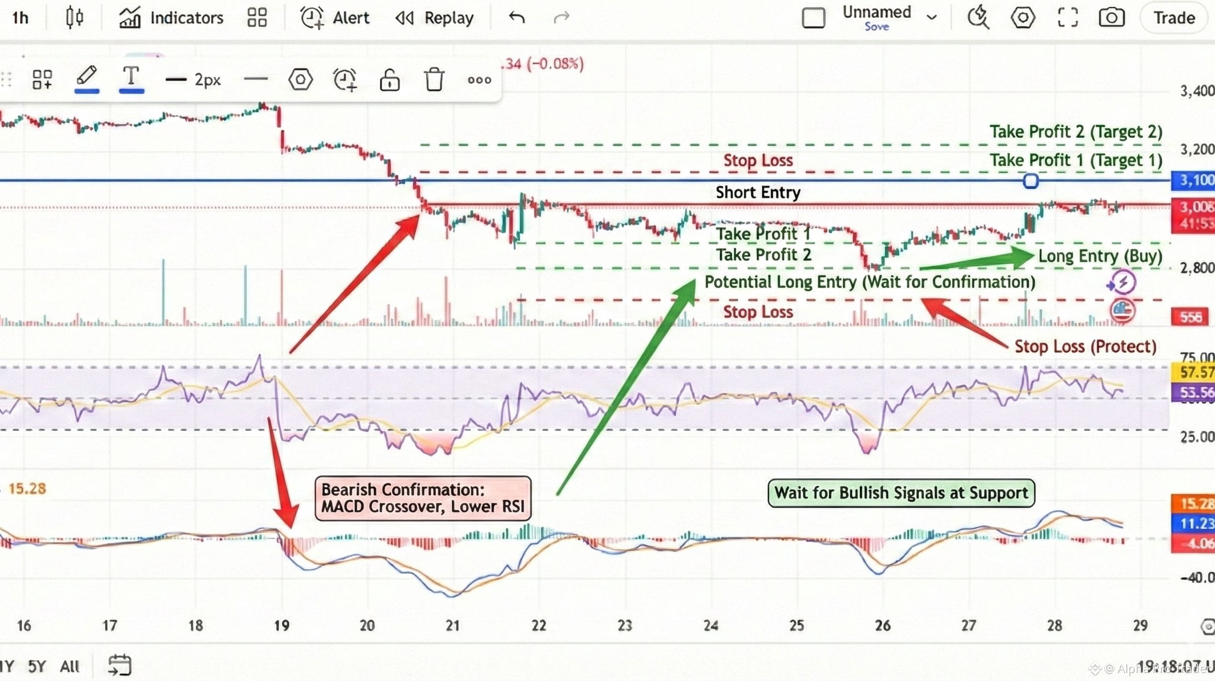 The Golden Rule: Do NOT just buy blindly if it hits those levels. As the chart notes, you must "Wait for Bullish Signals at Support". Look for the price to stabilize and bounce before jumping in.