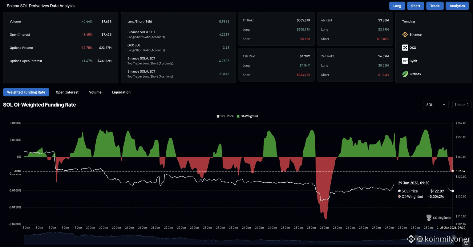 Futures Open Interest just dropped to $7.42B, showing positions are getting wiped or traders are pulling back. On top of that, long liquidations ($5.55M) crushed shorts ($1.34M), which usually means bulls got caught on the wrong side. Funding also flipped negative (-0.0042%), a sign more traders are leaning short than long right now.