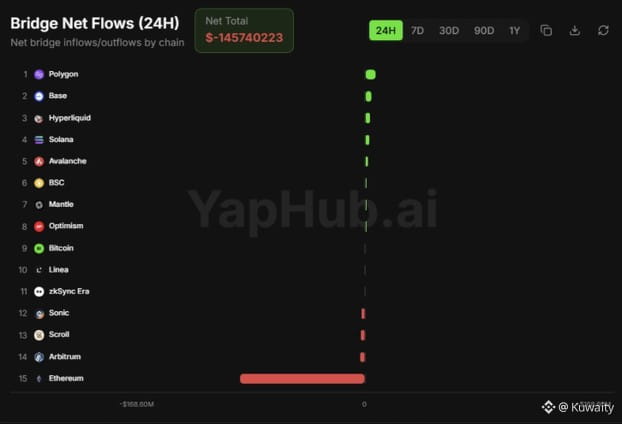 تمثل تدفقات خروج إيثيريوم عبر الجسور الأصول التي تنتقل من إيثيريوم إلى شبكات بلوكشين أخرى عبر الجسور المتقاطعة. تزداد هذه التحركات عندما يسعى المتداولون إلى رسوم أقل، أو تأكيدات أسرع، أو فرص عائد جديدة. يشير خروج 168 مليون دولار خلال 24 ساعة إلى إعادة تموضع متعمدة ومنسقة بدلًا من عمليات سحب عشوائية. نشر المستخدمون رأس المال عبر الشبكات بدلًا من الاحتفاظ بالأرصدة غير المستخدمة.